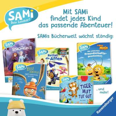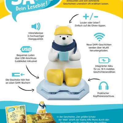 Mit SAMi - dein Lesebär tauchen Kinder ab 3 Jahre selbstständig in die Welt der Bilderbücher ein. Einfach ans Buch gesteckt, liest SAMi die Geschichte vor, während das Kind durch das Buch blättert. Dabei erkennt SAMi genau, auf welcher Seite sich das Kind befindet. Das Kind kann auf diese Weise frei im Buch vor- und zurückblättern und seine Lieblingsgeschichten beliebig oft anhören. So fördert SAMi die Selbstbeschäftigung und regt die Fantasie der Kinder an.
