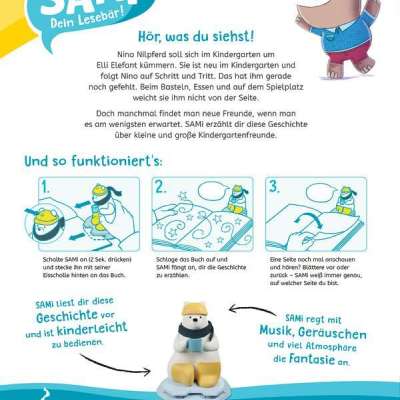 Mit SAMi - dein Lesebär tauchen Kinder ab 3 Jahren selbstständig in die Welt der Bilderbücher ein. Einfach ans Buch gesteckt, liest SAMi die Geschichte vor, während das Kind durch das Buch blättert. Dabei erkennt SAMi genau, auf welcher Seite sich das Kind befindet. Das Kind kann auf diese Weise frei im Buch vor- und zurückblättern und seine Lieblingsgeschichten beliebig oft anhören. So fördert SAMi die Selbstbeschäftigung und regt die Fantasie der Kinder an. SAMi kann verschiedene Bücher zu den unterschiedlichsten Themengebieten vorlesen: Neben wichtigen Themen aus dem Kinderalltag (z.B. Freundschaft, Streit), gibt es auch witzige Abenteuer und spannende Geschichten mit den Helden aus Filmen und Serien.