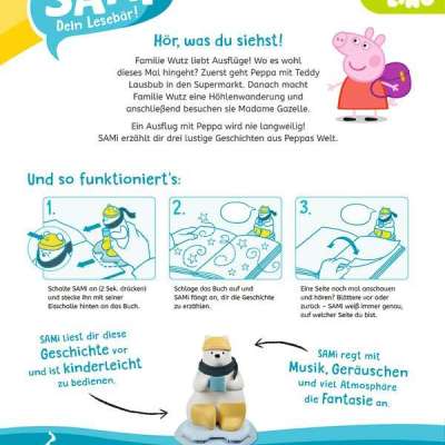 Mit SAMi - dein Lesebär tauchen Kinder ab 3 Jahren selbstständig in die Welt der Bilderbücher ein. Einfach ans Buch gesteckt, liest SAMi die Geschichte vor, während das Kind durch das Buch blättert. Dabei erkennt SAMi genau, auf welcher Seite sich das Kind befindet. Das Kind kann auf diese Weise frei im Buch vor- und zurückblättern und seine Lieblingsgeschichten beliebig oft anhören. So fördert SAMi die Selbstbeschäftigung und regt die Fantasie der Kinder an. SAMi kann verschiedene Bücher zu den unterschiedlichsten Themengebieten vorlesen: Neben wichtigen Themen aus dem Kinderalltag (z.B. Freundschaft, Streit), gibt es auch witzige Abenteuer und spannende Geschichten mit den Helden aus Filmen und Serien.