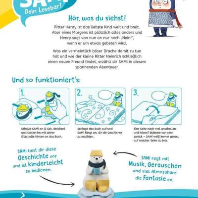 Mit SAMi - dein Lesebär tauchen Kinder ab 3 Jahren selbstständig in die Welt der Bilderbücher ein. Einfach ans Buch gesteckt, liest SAMi die Geschichte vor, während das Kind durch das Buch blättert. Dabei erkennt SAMi genau, auf welcher Seite sich das Kind befindet. Das Kind kann auf diese Weise frei im Buch vor- und zurückblättern und seine Lieblingsgeschichten beliebig oft anhören. So fördert SAMi die Selbstbeschäftigung und regt die Fantasie der Kinder an. SAMi kann verschiedene Bücher zu den unterschiedlichsten Themengebieten vorlesen: Neben wichtigen Themen aus dem Kinderalltag (z.B. Freundschaft, Streit), gibt es auch witzige Abenteuer und spannende Geschichten mit den Helden aus Filmen und Serien.