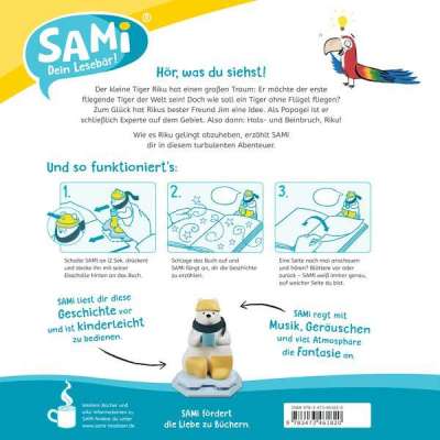 Mit SAMi - dein Lesebär tauchen Kinder ab 3 Jahren selbstständig in die Welt der Bilderbücher ein. Einfach ans Buch gesteckt, liest SAMi die Geschichte vor, während das Kind durch das Buch blättert. Dabei erkennt SAMi genau, auf welcher Seite sich das Kind befindet. Das Kind kann auf diese Weise frei im Buch vor- und zurückblättern und seine Lieblingsgeschichten beliebig oft anhören. So fördert SAMi die Selbstbeschäftigung und regt die Fantasie der Kinder an. SAMi kann verschiedene Bücher zu den unterschiedlichsten Themengebieten vorlesen: Neben wichtigen Themen aus dem Kinderalltag (z.B. Freundschaft, Streit), gibt es auch witzige Abenteuer und spannende Geschichten mit den Helden aus Filmen und Serien.