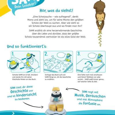 Mit SAMi - dein Lesebär tauchen Kinder ab 3 Jahren selbstständig in die Welt der Bilderbücher ein. Einfach ans Buch gesteckt, liest SAMi die Geschichte vor, während das Kind durch das Buch blättert. Dabei erkennt SAMi genau, auf welcher Seite sich das Kind befindet. Das Kind kann auf diese Weise frei im Buch vor- und zurückblättern und seine Lieblingsgeschichten beliebig oft anhören. So fördert SAMi die Selbstbeschäftigung und regt die Fantasie der Kinder an. SAMi kann verschiedene Bücher zu den unterschiedlichsten Themengebieten vorlesen: Neben wichtigen Themen aus dem Kinderalltag (z.B. Freundschaft, Streit), gibt es auch witzige Abenteuer und spannende Geschichten mit den Helden aus Filmen und Serien.