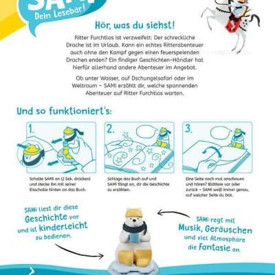 Mit SAMi - dein Lesebär tauchen Kinder ab 3 Jahren selbstständig in die Welt der Bilderbücher ein. Einfach ans Buch gesteckt, liest SAMi die Geschichte vor, während das Kind durch das Buch blättert. Dabei erkennt SAMi genau, auf welcher Seite sich das Kind befindet. Das Kind kann auf diese Weise frei im Buch vor- und zurückblättern und seine Lieblingsgeschichten beliebig oft anhören. So fördert SAMi die Selbstbeschäftigung und regt die Fantasie der Kinder an. SAMi kann verschiedene Bücher zu den unterschiedlichsten Themengebieten vorlesen: Neben wichtigen Themen aus dem Kinderalltag (z.B. Freundschaft, Streit), gibt es auch witzige Abenteuer und spannende Geschichten mit den Helden aus Filmen und Serien.