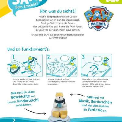 Mit SAMi - dein Lesebär tauchen Kinder ab 3 Jahren selbstständig in die Welt der Bilderbücher ein. Einfach ans Buch gesteckt, liest SAMi die Geschichte vor, während das Kind durch das Buch blättert. Dabei erkennt SAMi genau, auf welcher Seite sich das Kind befindet. Das Kind kann auf diese Weise frei im Buch vor- und zurückblättern und seine Lieblingsgeschichten beliebig oft anhören. So fördert SAMi die Selbstbeschäftigung und regt die Fantasie der Kinder an. SAMi kann verschiedene Bücher zu den unterschiedlichsten Themengebieten vorlesen: Neben wichtigen Themen aus dem Kinderalltag (z.B. Freundschaft, Streit), gibt es auch witzige Abenteuer und spannende Geschichten mit den Helden aus Filmen und Serien.