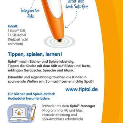 Tippen, spielen, lernen! tiptoi macht Bücher und Spiele lebendig. Tippen die Kinder mit dem Stift auf Bilder und Texte, erklingen Geräusche, Sprache und Musik. So macht Lernen richtig Spaß! Das tiptoi-Sortiment umfasst Bücher und Spiele mit den wichtigsten Lern- und Wissensthemen für Kinder ab 2 Jahren. Die zugehörigen Audiodateien lädt man einfach, sicher und schnell über den tiptoi Manager oder die optional erhältliche Ladestation auf den Stift.