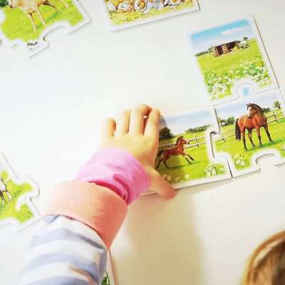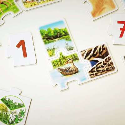 Was fressen Enten und wo wohnen Füchse? Im Kinderspiel Alle meine Tiere erfahren 1-4 Kinder ab 3 Jahren auf großen Puzzlekarten alles über heimische Tiere.