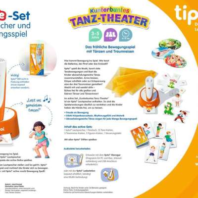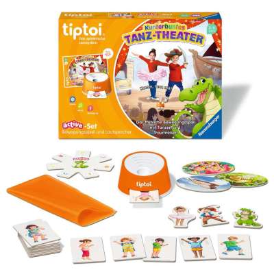 Mit dem "ACTIVE Set Kunterbuntes Tanz-Theater" kommt Musik ins Spiel. 1 bis 6 Kinder ab 3 Jahren stellen sich ihren eigenen Tanz zusammen. Abbildungen auf Karten und die Erklärung von tiptoi helfen, die Bewegungen mitzumachen. Liebevolle Musikstücke und das Tanztuch motivieren zum Tanzen. Der tiptoi-Stift steht in einem Lautsprecher, damit sind die Texte gut zu verstehen und die Kinder haben die Hände frei, um im Raum zu tanzen.