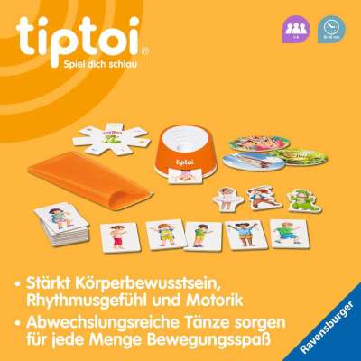 1 tiptoi-Lautsprecher, 1 Steuerungstafel, 15 Tanz-Karten, 3 Figuren-Karten, 3 Traumreise-Karten, 1 Tanztuch. tiptoi-Stift nicht enthalten. Muss separat erworben werden.