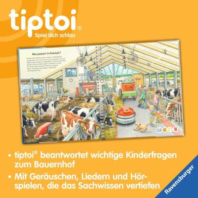Das Starter-Set ist perfekt für den Einstieg in tiptoi. Die benötigte Audiodatei ist auf dem Stift vorinstalliert, der integrierte Akku geladen. Im Sachbuch erleben Kinder den Alltag in der modernen Landwirtschaft.