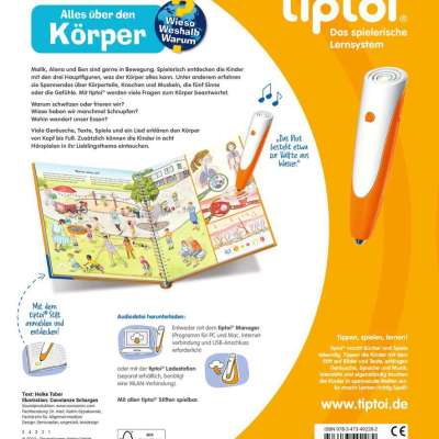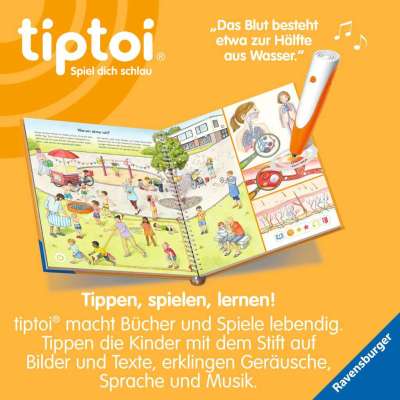 Welches sind die kleinsten und größten Knochen des Körpers? Warum schwitze oder friere ich? Und was tut dem Körper gut? In diesem Buch erfahren Kinder allerhand Wissenswertes über die verschiedenen Bestandteile des menschlichen Körpers. Anhand von Szenen aus dem Kinderalltag erklärt tiptoi den kleinen Entdeckern, wie ihr Körper funktioniert: Beim Seifenblasenpusten ist die Lunge im Einsatz, nach der Wasserschlacht haben die Kinder Gänsehaut und auf dem Klettergerüst sind Muskeln gefragt.