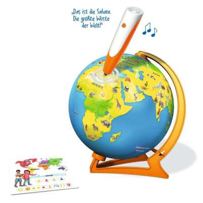 Der Stift erweckt die Kontinente zum Leben und vermittelt dabei kindgerechtes Wissen über Menschen, Tiere, Bauwerke und Landschaften. Durch Quiz- und Suchaufgaben in drei Schwierigkeitsgraden vertiefen die Kinder, was sie bei ihrer Reise um den Globus gelernt haben. Die zwei Halbschalen des Globus werden einfach und schnell zusammengesteckt. Im mitgelieferten Drehständer steht er stabil und dekorativ