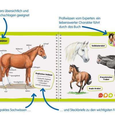 Kompaktes Sachwissen zum Mitnehmen rund um das Thema "Pferde und Ponys": Mit tiptoi® entdecken die Kinder interaktiv verschiedene Pferde- und Ponyrassen und erfahren Wissenswertes über das Leben der Tiere.
