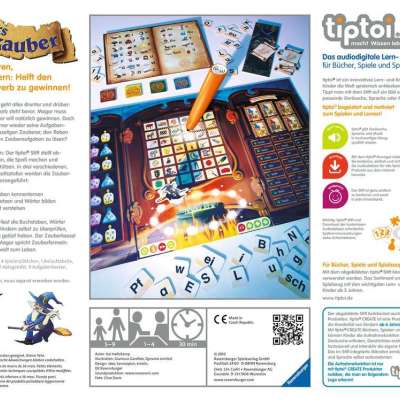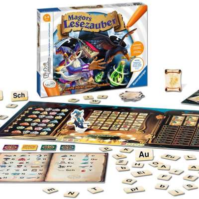 1 Spielplan, 1 Zauberer-Figur, 1 Ablagetafel, 1 Zauberbuch mit Anlauttabelle, 9 Aufgabenkärtchen, 4 Spielerplättchen, 37 Buchstabenkärtchen tiptoi® Stift nicht enthalten, muss separat erworben werden