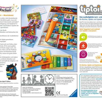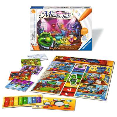 Im Kinderspiel Die monsterstarke Musikschule lernen Kinder ab 4 Jahren die verschiedenen Aspekte der Musik kennen: Von Gehörschulung über Singen bis hin zu Instrumentenkunde. Welche Band gewinnt am Ende den Musik-Wettbewerb? Mit tiptoi erwerben die Kinder spielerisch musikalisches Sachwissen über Instrumente und klassische Musik, musizieren selbst und erfahren, warum ein gutes Gehör oft sehr nützlich sein kann.