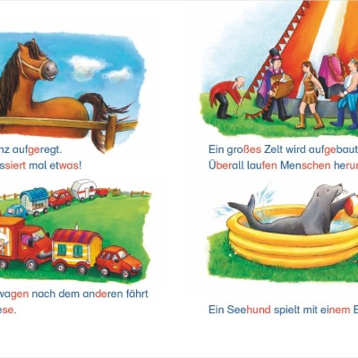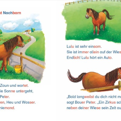 Neben Pony Lulus Wiese schlägt ein Zirkus sein Zelt auf. Was die Tiere alles können! Lulu staunt. Sie kann nur laufen - vorwärts, rückwärts und im Kreis! Ob sie mit Sabrina im Zirkus auftreten kann?