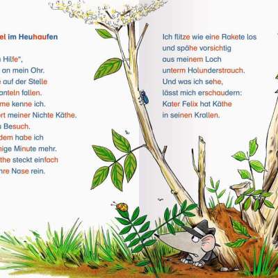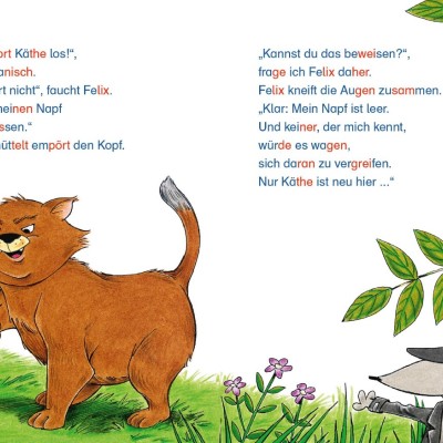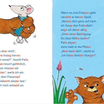Der Fressnapf von Kater Felix ist leer und er beschuldigt die Maus Käthe. Gut, dass ihr Onkel ein Detektiv ist und sich auf die Suche nach dem wahren Dieb macht. Auch Käthe liest fleißig Spuren und sammelt Beweise.