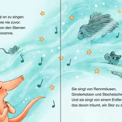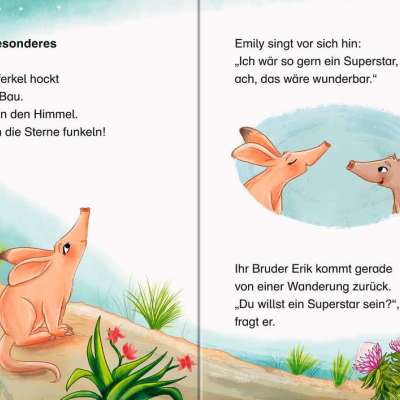 Nachts, wenn die Sterne funkeln, träumt Emily Erdferkel davon, ein Star zu sein. Aber kann Emily etwas besonders gut? Sie macht einen Spaziergang durch die Savanne und trifft Roco Rennmaus, der superschnell durch die Gegend flitzt. Kann Emily auch so schnell laufen? Oder kann sie so anmutig tanzen wie die Ginsterkatze? Oder so schick aussehen wie die Stachelschweine in ihrem schwarz-weißen Kleid? Es scheint, als hätte sie kein herausragendes Talent. Doch dann klopft der Löffelhund an ihre Tür.