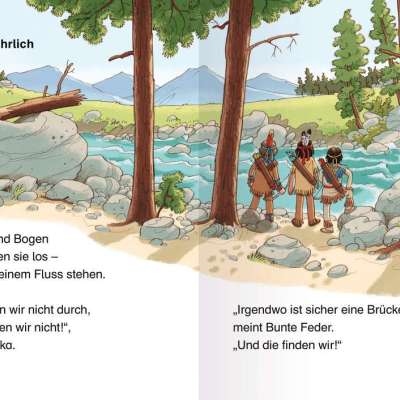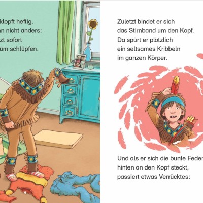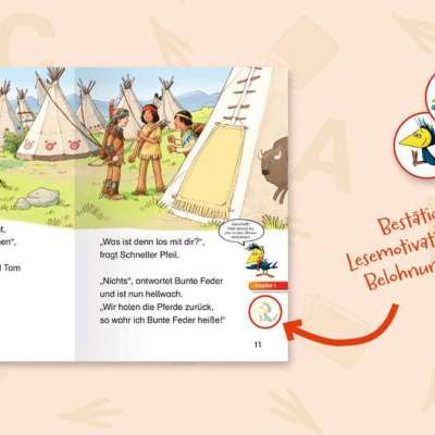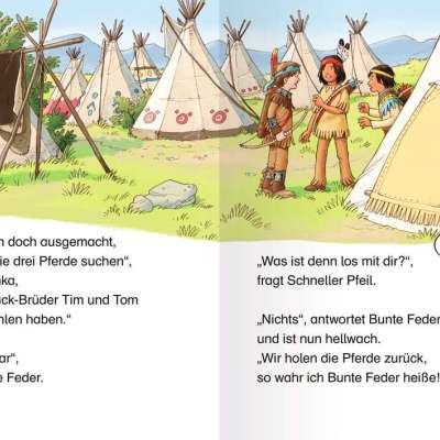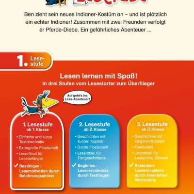 So macht Lesenlernen Spaß!Als Ben sein neues Indianer-Kostüm anzieht und die Feder ins Stirnband steckt, findet er sich plötzlich in einem Indianerdorf wieder. Doch in der Gegend treiben Pferdediebe ihr Unwesen und Ben nimmt zusammen mit zwei Indianerjungen die Verfolgung auf. Nachdem sie eine brüchige Brücke überquert haben, entdecken sie die Gauner am Lagerfeuer. Die Indianerjungen lenken die Diebe ab und befreien die Pferde, eine wilde Verfolgungsjagd beginnt. Auf dem Rückweg müssen sie erneut über die Brücke. Ben reitet als Letzter hinüber und prompt stürzt hinter ihm die Brücke ein. Nun haben die Jungs ihre Verfolger abgeschüttelt! Im Dorf werden die Kinder begeistert begrüßt. Ein kleiner Junge fragt Ben, ob es seine Feder haben darf. Als Ben sie aus seinem Stirnband zieht, steht er plötzlich wieder bei sich zu Hause. War das alles etwa nur ein Traum? Nein! Mit der magischen Feder kann Ben jederzeit neue Indianerabenteuer erleben!Spannende Indianergeschichte für Leseanfänger ab Klasse 1.