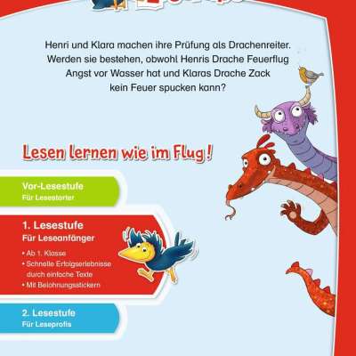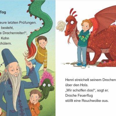 Henri und Klara machen mit ihren Drachen Feuerflug und Zack ihre Abschlussprüfung als Drachenreiter. Zu dumm nur, dass Feuerflug Angst vor Wasser hat und Zack kein Feuer spucken kann. Bestehen sie trotzdem die Prüfung?