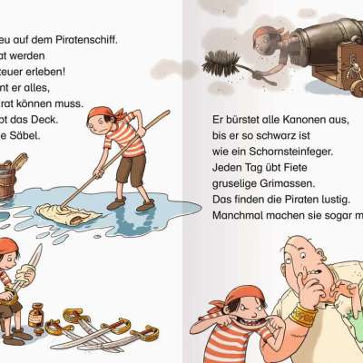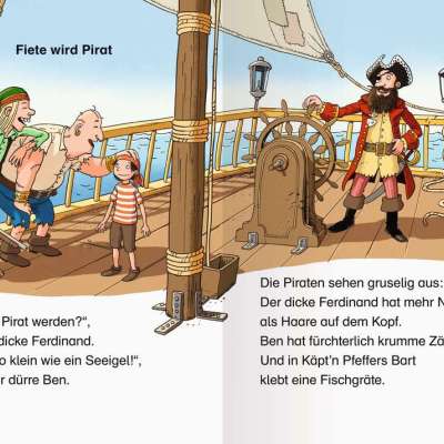 Fiete lernt Deck schrubben und Piratenlieder singen. Besonders gern hilft er Käpt’n Pfeffer in der Kombüse beim Kochen, und sein Essen kommt auch gut an bei den anderen Piraten. Aber am liebsten sitzt Fiete im Ausguck. Wann kommt endlich ein fremdes Schiff, das sie entern können? Deshalb ist er doch Pirat geworden! Sogar bei dem großen Sturm bleibt er oben hocken – und da kommt ein Handelsschiff in Sicht. Fertigmachen zum Entern! Fiete hat sich für seinen ersten Einsatz etwas ganz Besonderes überlegt: Am Seil schwingt er sich vom Ausguck auf das fremde Schiff! Aber der Sturm reißt ihn fort, er segelt über das Schiff hinweg und platscht ins Meer. Hilfe! Käpt’n Pfeffer wartet keine Sekunde und springt hinterher. Er rettet Fiete – aber wo sind die Schiffe? Da werden sie gepackt und aus dem Wasser gezogen – von den Seeleuten des Handelsschiffes! Am nächsten Tag liegen Fiete und Käpt’n Pfeffer krank im Bett. Käpt’n Pfeffer kommt ins Grübeln. Warum haben die Seeleute sie gerettet, obwohl sie gerade ihr Schiff entern wollten? Und ist Pirat wirklich das Richtige für einen Jungen wie Fiete? Aber Käpt’n Pfeffer kann nichts anderes als Pirat sein ... Da bringen die anderen Piraten den beiden Patienten das Essen – es schmeckt scheußlich. Ja, wenn nur Fiete und Käpt’n Pfeffer wieder kochen würden! Da hat der Käpt’n eine Idee. Er verkauft sein Schiff und kauft dafür ein kleines Hafenrestaurant. Und darin kochen er und Fiete das beste Piratenessen der Welt!