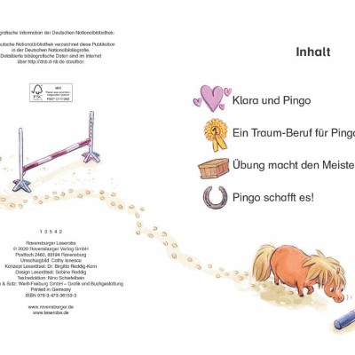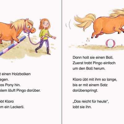 Klaras besucht Pingo jeden Tag im Stall, reitet auf ihm und erzählt ihm, was so los ist. Heute erzählt sie ihm von der Schule, da haben sie über Berufe geredet. Klara will vielleicht mal Astronautin werden. Oder Tierärztin. Und sie weiß, dass es auch Berufe für Ponys gibt. Pingo könnte Hochzeitskutschen ziehen oder mit Polizisten auf Streife gehen. Aber das will Pingo nicht. Das Pony nickt erst, als Klara vorschlägt, dass Pingo auch Turnierpferd werden könnte. Dafür müsste er aber über Hindernisse springen können. Der doofe Basti bekommt mit, worüber Klara und Pingo „reden“, und lacht Klara aus. Ein Pony kann doch nicht Turnierpferd werden! Jetzt erst recht, denkt Klara und fängt an, mit Pingo zu üben. Tatsächlich traut Pingo sich über keins der Hindernisse. Deshalb trainieren sie mit kleineren Dingen. Pingo lernt, über einen Ball zu springen, dann über eine Holzkiste. Und schließlich schafft er ein echtes Hindernis! Das muss Basti sehen. Und der staunt nicht schlecht. Wenn man etwas wirklich will, dann schafft man es auch!