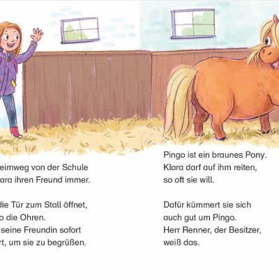Klaras bester Freund heißt Pingo und ist ein Pony. Pingo will Turnierpferd werden, aber der doofe Basti sagt, dass ein Pony das nicht kann. Deshalb übt Klara ganz viel mit Pingo.