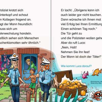 Tom besucht mit seiner Klasse ein Polizeirevier. Als der Kommissar von drei Verdächtigen erzählt, weiß Tom gleich, wer von ihnen der Dieb ist. Emma sucht ihre Katze und beobachtet, wie eine Frau mit dieser davonfährt. Emma folgt ihr und kann der Polizei beweisen, wo sich ihr Krümel befindet. Luca erfährt im Urlaub vom Raub einer Münzsammlung. Beim Tauchen sieht er einen Mann mit Truhe. Ob das der Dieb ist?