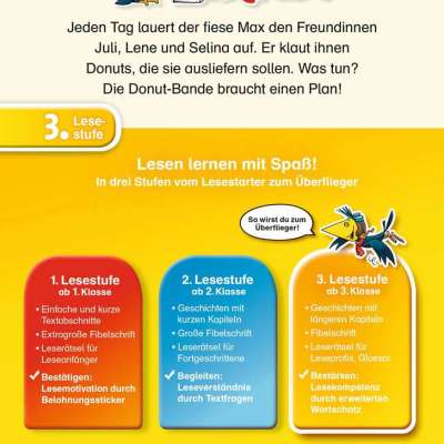 Verflixt und zugenäht! Jeden Tag lauert der fiese Max den Freundinnen Juli, Lene und Selina auf und klaut ihnen Donuts, die sie für Julis Bruder Tom ausliefern sollen. Was tun? Die Donut-Bande braucht einen Plan! Spannende Freundschaftsgeschichte für Erstleser ab Klasse 3.