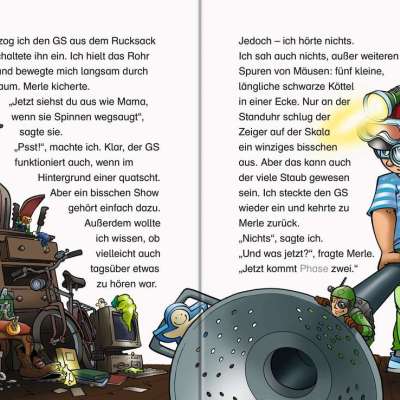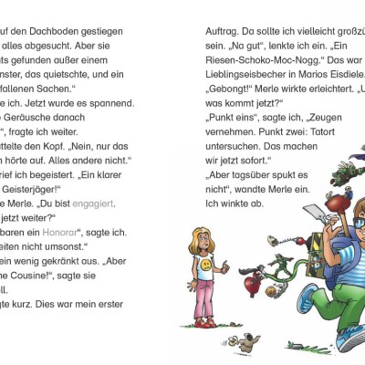 Ich betreibe ein Geisterjäger-Büro. Meine erste Kundin war meine Cousine Merle. Über dem Zimmer ihres kleinen Bruders waren nachts auf dem Dachboden seltsame Geräusche zu hören. Ich sollte herausfinden, was da los ist. Zuerst befragte ich Leo. Er beschrieb, was er nachts hörte: leises Trippeln, lautes Scheppern, schrilles Quieken, kurze, spitze Schreie, Geheule, Pfeifen, dumpfes Poltern. Das ganze Programm. Danach untersuchte ich den Tatort. Auf dem Dachboden stand viel Kram. Und ich entdeckte Mäusespuren. Mein Geister-Sensor schlug nicht aus. Also übernachtete ich bei Merle und Leo und nahm auch meinen Kater Mr. Hobbs mit. Als nachts die Geräusche losgingen, stieg ich auf den Dachboden, obwohl Merle mich warnte, dass das doch Einbrecher sein konnten! Ich lauerte im Dunkeln auf der Treppe, es trappelte und quiekte, ich schaltete meine Taschenlampe ein – Siebenschläfer! Die hatten hier so einen Lärm veranstaltet! Ich wollte gerade nach unten gehen, um die frohe Botschaft zu verkünden, da hörte ich ein Kichern. Ein gruseliges nicht-menschliches Kichern! Bevor ich dem aber auf den Grund gehen konnte, rief Merle, und ich musste runter. Ich wollte sie nicht beunruhigen, deshalb erzählte ich ihr nur von den Siebenschläfern, und dass ich die Nacht mit Mr Hobbs oben verbringen würde, um Mäuse und Siebenschläfer zu vertreiben. Mit etwas mulmigem Gefühl lag ich kurz darauf auf meiner Luftmatratze auf dem Dachboden. Es war dunkel und still. Bis Mr Hobbs plötzlich anfing zu knurren. Ich sprang auf, eine Sekunde später polterte ein Kleiderständer auf mein „Bett“. Ich leuchtete herum – und entdeckte den hässlichsten Geist aller Zeiten auf der alten Standuhr von Merles Opa. Ich verpasste ihm eine Ladung GAS (Geisterabwehrschleim), dann sprach ich ihn an. Und er antwortete! Erst wütend, dann eher verzweifelt. „Warum werde ich hier nicht in Ruhe gelassen? Vorher habe ich in einem herrlich feuchten Keller gelebt, da will ich wieder hin.“ Leider konnte ich nicht länger mit ihm sprechen, weil mein Onkel auf den Dachboden kam und wissen wollte, was los ist. Es dauerte ziemlich lange, den Erwachsenen zu erklären, was ich da machte ... Später brachten Merle und ich den Geist, der in der Opa-Standuhr auf den Dachboden gekommen war, dann in einer Tupperdose auf die Festung Hohensiefen, wo er jetzt ganz in Ruhe jede Nacht herumspuken kann!
