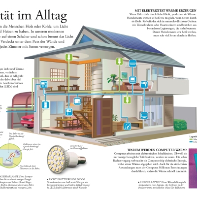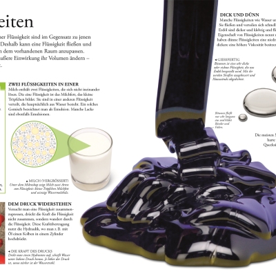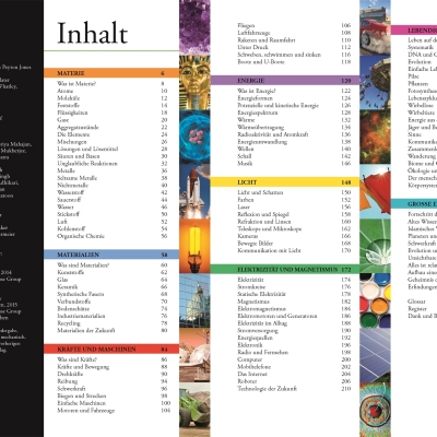 Als Teil der erfolgreichen Reihe „Wissen für clevere Kids“ werden zunächst grundlegende Fragen geklärt: Was ist Materie? Oder wie ist ein Atom aufgebaut? Weiterhin werden zentrale Fragen aus Chemie, Physik und Biologie behandelt. Insgesamt finden sich darin weit über 1.500 Grafiken und viele davon großformatig auf Doppelseiten: So können die Besonderheiten aus Natur und Technik ansprechend präsentiert werden, wie zum Beispiel eine gigantische Tunnelbohrmaschine, stark vergrößerte Schneekristalle oder ein leuchtendes Glühwürmchen. Zahlreiche Übersichtskästen, die wichtige Fakten zu chemischen Reaktionen, optischen Linsen oder Tierklassen aufführen, ergänzen den Text.