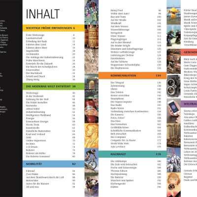 Ob Glühbirne, Elektronenmikroskop, Toaster, Zahnpasta oder Toilettenpapier: In diesem umfangreichen Nachschlagewerk der „Wissen für clevere Kids“-Reihe finden Mädchen und Jungen packende Informationen und faszinierende Bilder zu den größten Erfindungen der Menschheitsgeschichte. Über 700 bahnbrechende Entdeckungen werden in Steckbriefen alltagsnah, spannend und informativ präsentiert. Anschauliche Galerieseiten zeigen die Entwicklung einer Erfindung auf einen Blick. In ausführlichen Profilen begegnen die Kids den größten Erfindern der Geschichte.