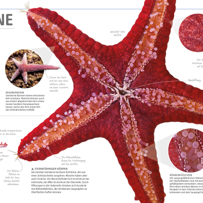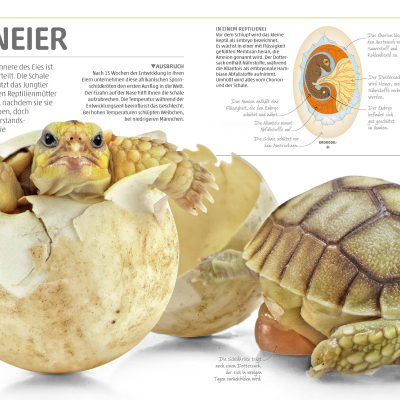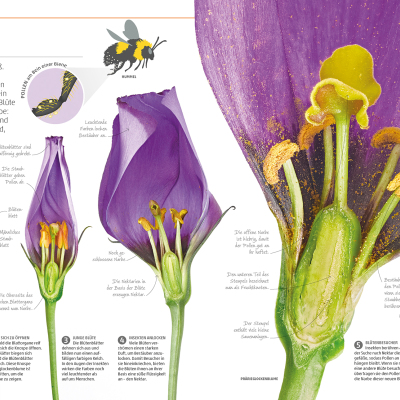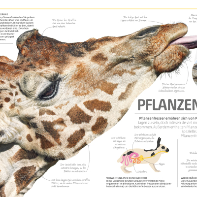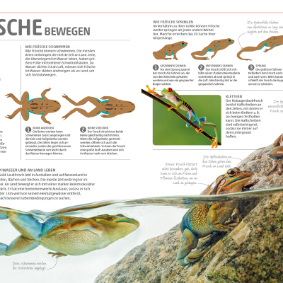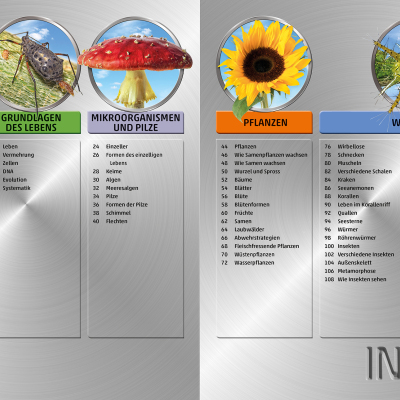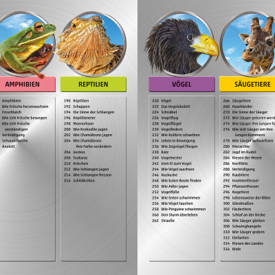 Pflanzen, Fische oder Amphibien: Die zehn großen Kapitel der Enzyklopädie decken die wichtigsten Themen des Pflanzen- und Tierreichs ab und gehen auf Aspekte, wie Lebensräume, Sinnesorgane, Fortbewegung oder Vermehrung, ein. Sie dienen dazu, ein grundlegendes Verständnis für die Natur und ihre Prozesse zu entwickeln. Die beeindruckenden Detailaufnahmen des Lexikons zeigen zum Beispiel die Zähne eines Hais, die Antennen eines Schmetterlings oder sie erklären, wie aus einem Samen eine Sonnenblume wird oder wie sich eine Schlange häutet – das sorgt für einen Wow-Effekt bei Groß und Klein! Ohne lange Texte lesen zu müssen, informiert das bildgewaltige, umfassende Naturlexikon auf diese Weise über Abläufe von Tieren, Pflanzen, Algen oder Mikroorganismen.
