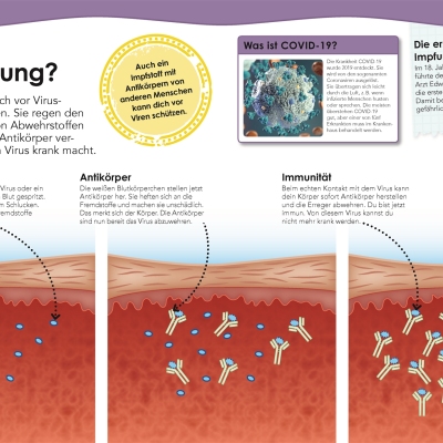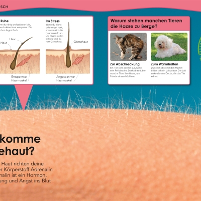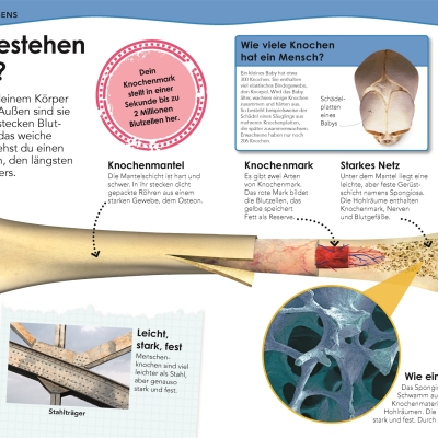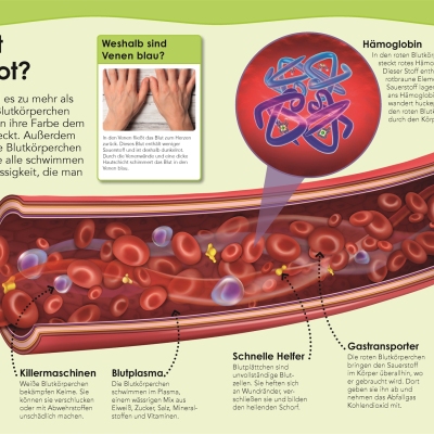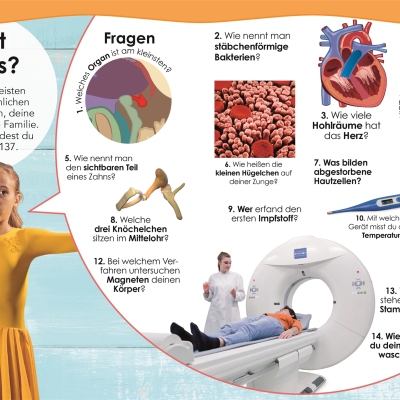 Ob die Funktionsweise der Lunge, die Bestandteile von Knochen oder wichtige Aspekte rund um die Gesundheit – der menschliche Körper wirft viele interessante Fragen auf: Wie oft atmen wir pro Tag? Warum müssen wir gähnen? Wozu braucht unser Körper Wasser? Warum träumen wir? Jede Doppelseite des Kinderlexikons beginnt mit einer dieser Fragen – gefolgt von einer Antwort, die Sachverhalte und Zusammenhänge auf verständliche Art und Weise erklärt. Aufgebaut sind die Doppelseiten um ein faszinierendes Bild herum: Egal ob ein DNA-Strang, der Aufbau einer Zelle oder die Stationen des Verdauungstrakts – die spektakulären Fotos und Grafiken ermöglichen einen einzigartigen Blick ins Innere unseres Körpers und veranschaulichen das Thema einprägsam.