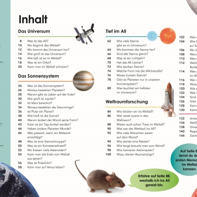 Auf geht’s zu einer rasanten Reise durchs All! Ob Raumfahrt oder Weltall – unser Universum wirft viele interessante Fragen auf: Warum funkeln Sterne? Wie groß ist das Universum? Gibt es Leben auf dem Mars? Was ist ein Schwarzes Loch? Wie startet eine Rakete?