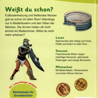 Die altersgerecht aufbereiteten Informationen sind für Leseanfänger einfach verständlich, so dass auch schwierige Zusammenhänge deutlich werden. Viele bunte Fotografien und Illustrationen veranschaulichen das Thema und helfen, das Gelesene zu begreifen. Wissenstests, Bilderrätsel und ein Römer-Rennen regen zum Mitmachen an und vertiefen spielerisch das Gelernte. Ein Glossar am Ende des Buches erklärt schwierige Wörter und »Weißt du das?«-Kästen heben besonders interessante Fakten hervor. Durch die optimale Ausgewogenheit von Bild und Text ist »memo Kids – Das alte Rom« ideal zum Vor- oder Selberlesen geeignet.