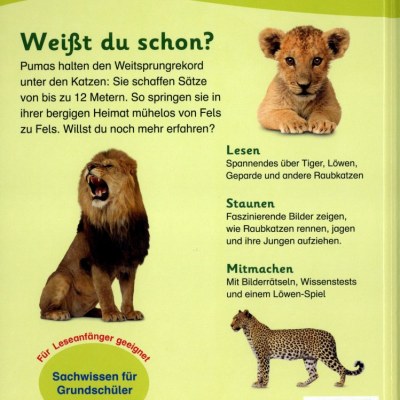 Lesen, staunen, mitmachen – das ist das Motto von memo Kids! Wo leben Pumas? Wie weit können Pumas springen? In Band 19 der Wissensreihe für Erstleser dreht sich alles um große Raubkatzen. Kurze, lebendige Texte erzählen Spannendes über Tiger, Löwen, Geparde und andere Raubkatzen. Faszinierende Bilder zum Staunen zeigen, wie die Tiere rennen, jagen und ihre Jungen aufziehen.
